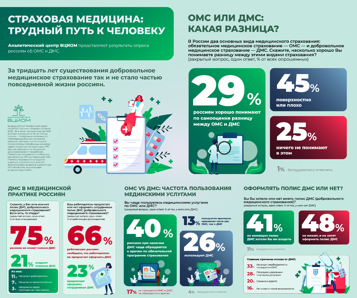 Спустя три десятилетия после своего появления в России добровольное медицинское страхование (ДМС) по-прежнему не распространено среди наших граждан. Подавляющее большинство россиян (75%) не имеют полиса ДМС. Главная проблема — плохая осведомленность населения о страховании. Лишь 29% россиян заявляют, что хорошо понимают разницу между обязательным (ОМС) и добровольным (ДМС) медицинским страхованием. Четверть опрошенных признаётся, что вообще ничего не знает об этом различии, а ещё 45% имеют лишь поверхностные или плохие представления. Уровень осведомлённости резко падает с возрастом: среди поколения оттепели доля ничего не знающих достигает 40%. Работодатели, как ключевой канал распространения ДМС, предлагают его нечасто. Среди работающих россиян две трети сообщают, что их работодатель не предлагает оформить полис. Лишь 23% работающих получают такое предложение. Но даже наличие ДМС не гарантирует его использование. Главные причины отказа не в недоверии или сложности оформления, а в бана