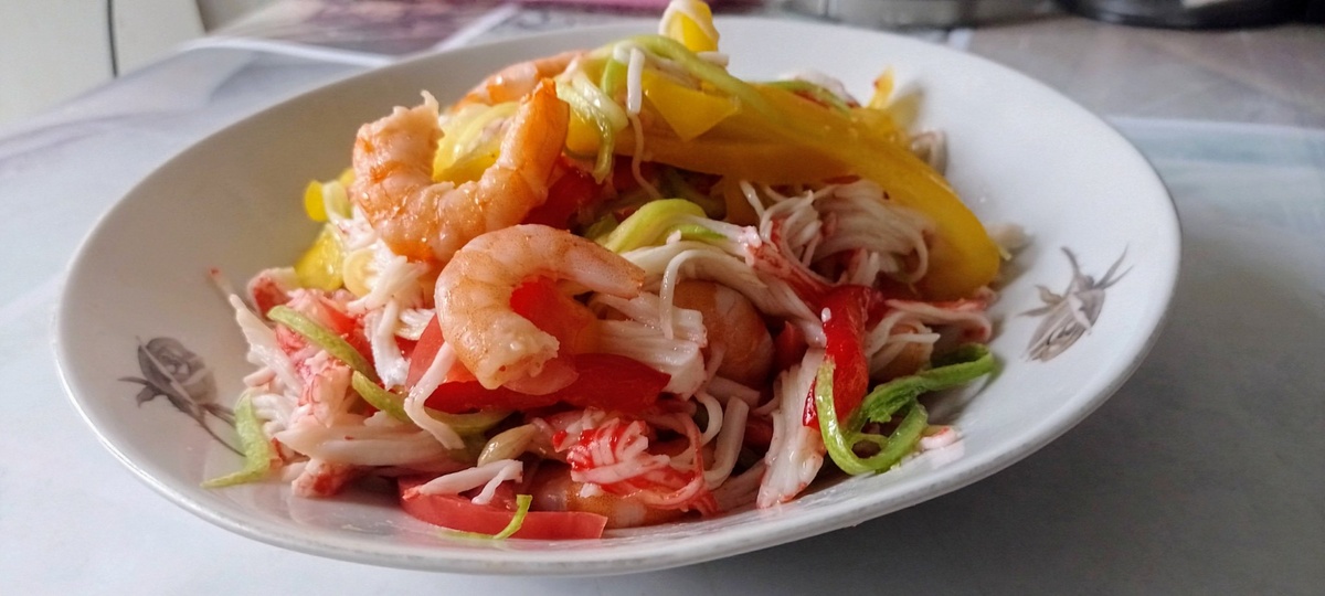 Легкий салат из креветок , снежного краба с кусочками манго