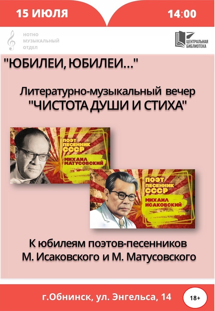 👥15 июля в 14:00 в Центральной библиотеке в Обнинске состотся литературно-музыкальный вечер к юбилеям поэтов-песенников М. Исаковского и М. Матусовского. Вход свободный. Обнинск, ул. Энгельса, 14. 👍 Подписаться | Ваша реклама
