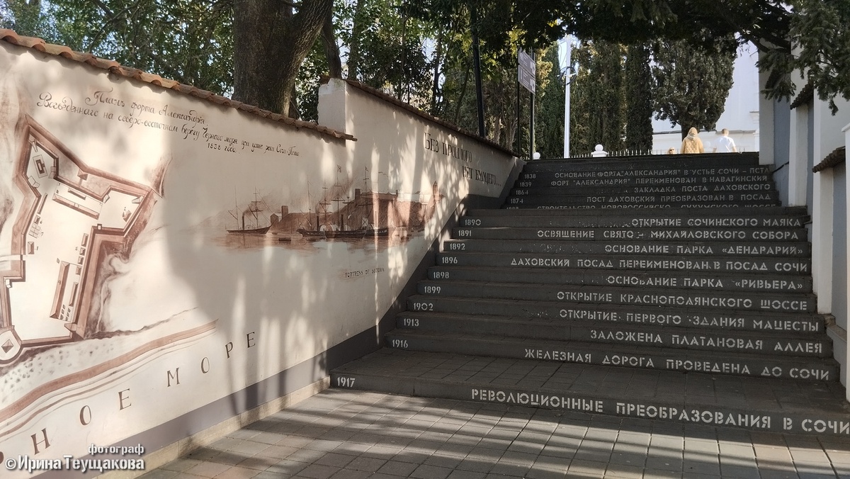 В центре Сочи, недалеко от морского вокзала есть интересная лестница с надписями на ступенях, где отражена история города от небольшого прибрежного форта до современного курорта, принимающего крупнейшие международные мероприятия. Она находится на месте первой улицы города — Эллинского спуска, который в XIX веке шёл от Навагинского форта в сторону моря. Спускаясь вниз по лестнице, сразу обращаешь внимание на обрамляющие её стены, а при взгляде снизу вверх видно главное: на торцах ступеней написаны даты и события. Постройка первого форта и его переименование, закладка нового укрепления, открытие Сочинского маяка, основание парка «Дендрарий», железная дорога, революция, основание Кавказского заповедника и открытие аэропорта — все ключевые события в жизни Сочи вплоть до Всемирного фестиваля молодёжи в 2024 году. На стене вдоль лестницы расположены исторические фотографии и описания событий. Очень интересно рассматривать снимки и читать исторические материалы! На другой стене — схема форта