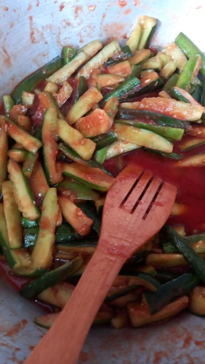 Томат пастасындагы кыяр рецепты. Быел кыяр бик күп, дуслар! Түбәндәге салатны ясап карагыз әле, бик тәмле гарнир килеп чыгачак. 3-4 килограмм кыярны телемләп яки озынчага турарга кирәк. Шуңа 500 грамм томат пастасы, 1 стакан шикәр комы, 1 стакан сыек май, 2 аш кашыгы тоз, вак итеп туралган яки угычтан чыгарган 2 баш сарымсак, 1 чәй кашыгы төелгән кара борыч салып, әйбәтләп болгатасың да, 3 сәгать ял иттерәсең. Ара-тирә болгаткалап алырга кирәк. 3 сәгать узгач, газга куеп 15 минут кайнатып чыгарабыз да, 180 миллилитр уксус салып, яңадан яхшылап болгатырга кирәк. Әзер салатны стерильләштерелгән банкаларга тутырып ябып куябыз. Тәмле булсын!