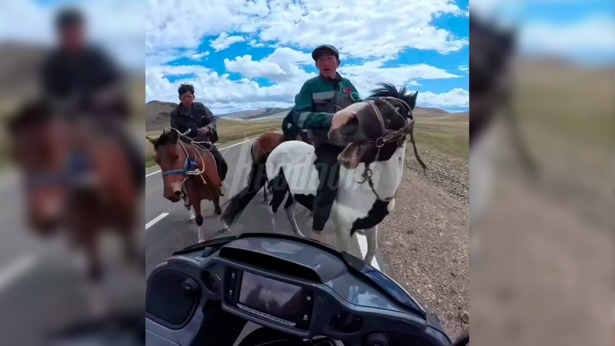 Мотоциклист дал отпор конному патрулю в монгольской степи