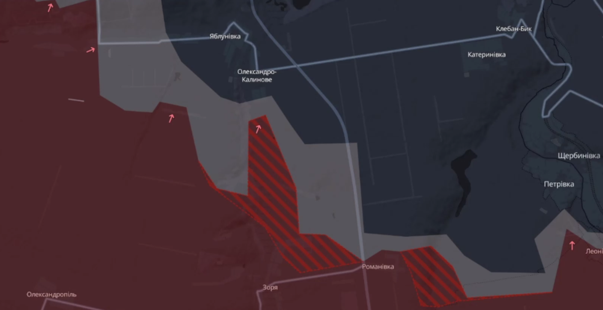ВСУ сопротивляются отчаянно. Некоторое время назад нашим подразделениям удалось на плечах отступающего врага зайти в Александро-Калиново, но закрепиться не удалось. Противник подтянул резервы, наши парни отошли. Сейчас село окружено рвом шириной в 4 метра, по краям которого установлены зубы дракона, а на дне - путанка. В населенный пункт ведут два прохода через ров, которые полностью контролируются операторами fpv-дронов и тяжелых БПЛА-бомбардировщиков противника. Понятно, что штурмовикам очень непросто заскочить в село, подтянуть резервы и приступить к зачистке. Вот, как вражеские ресурсы рисуют обстановку на данный момент: