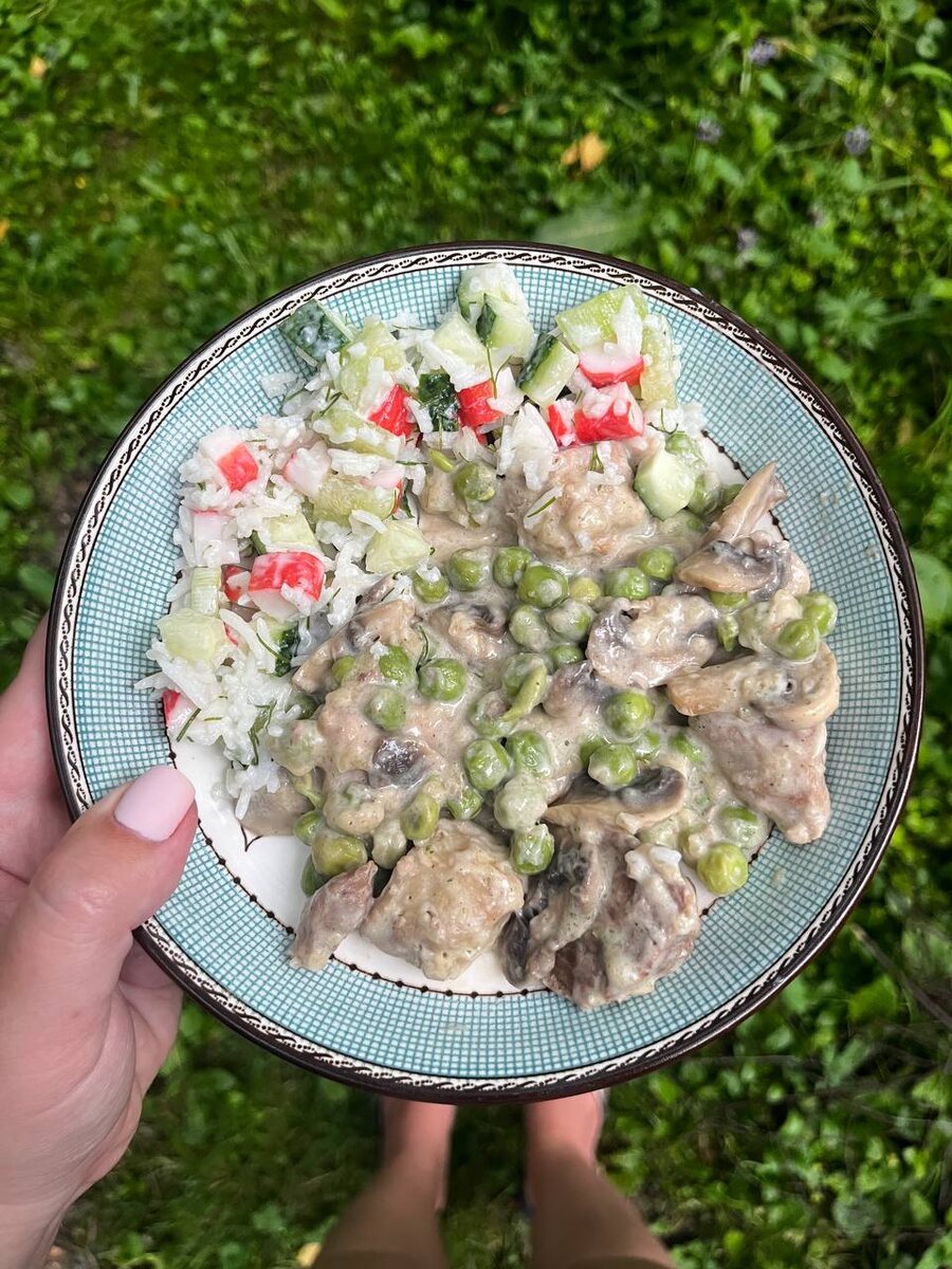 Бедро индейки — одно из моих любимых блюд. Могу есть хоть каждый день — вкуснее всех чипсов и тортов. Ингредиенты: • бедро индейки — 500 г • шампиньоны — 200–250 г • зелёный горошек — по вкусу (можно замороженный) • сметана — 2 ст. л. (можно больше) • мука — 2 ст. л. Как готовить: • Нарежьте индейку кубиками, обжарьте на разогретой сковороде, периодически помешивая. • Когда мясо покроется лёгкой корочкой, добавьте грибы. Накройте крышкой — грибы пустят сок. • Как только всё немного протушится, добавьте зелёный горошек и перемешайте. • Введите сметану, снова перемешайте. • Добавьте муку — соус загустеет и превратится в насыщенную подливу, которая отлично обволакивает мясо и овощи. • Держите на огне до готовности. Получается сытное, ароматное блюдо. Идеально с пюре, но можно и с любым гарниром❤️ У меня на этот раз был салат из того, что нашлось в холодильнике — крабовые палочки, огурцы, рис. Приятного аппетита! КБЖУ (на 100 г): 273.0 ккал • Б 6.4 г • Ж 10.5 г • У 36.6 г ❤️ ❤️ ❤️ Забира