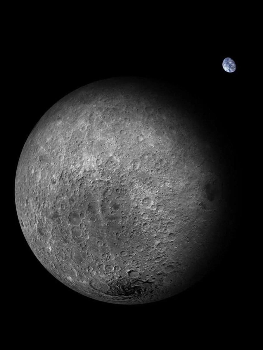 Обратная сторона Луны с Землей на фоне