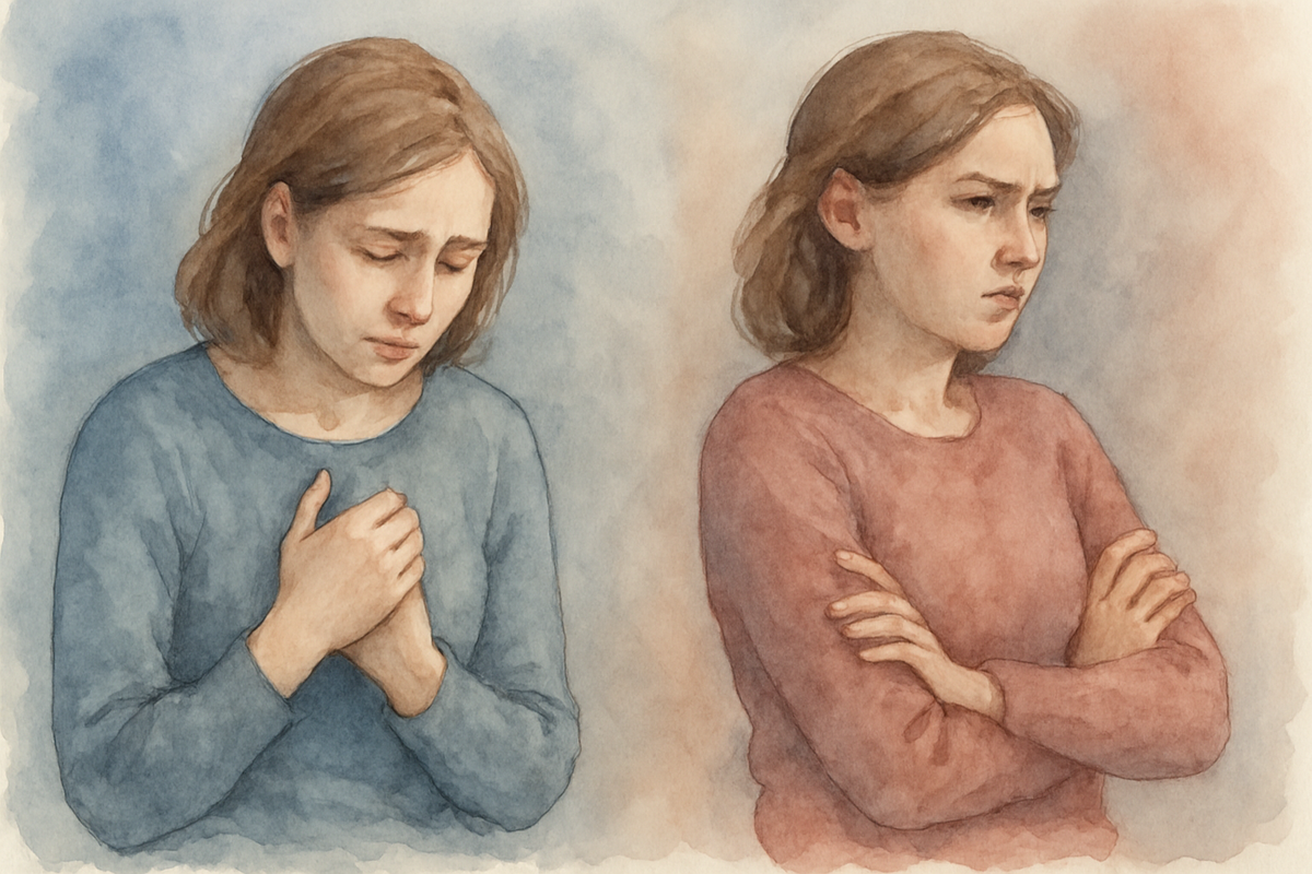 Иногда человек говорит: «Я злюсь на него, потому что он меня обидел», — а потом, через минуту, добавляет: «Но, наверное, я и сама виновата». Или наоборот: сначала признаётся в чувстве вины, а потом признаёт: «Но ведь и он был несправедлив…» Так часто идут рядом эти два чувства — вина и обида. Они как будто держат друг друга за руку, не отпуская. Когда нас обижают — мы чувствуем боль, разочарование, злость. Но если нам с детства внушали, что «злиться — это плохо» или «будь выше», мы не даём себе прожить обиду. Вместо этого переключаемся на вину: «Может, я сама как-то не так сказала», «Наверное, я спровоцировала», «Я же знала, с кем связываюсь»… И обида не исчезает — она уходит вглубь, копится. А поверх остаётся чувство вины, которое ещё и съедает изнутри. В другом варианте всё наоборот: мы сами кого-то обидели, сделали что-то резкое, и вроде бы понимаем — виноваты. Но вместо того чтобы признать это честно, внутри возникает ответная обида: «А почему я должна всё тащить?», «А он разве не