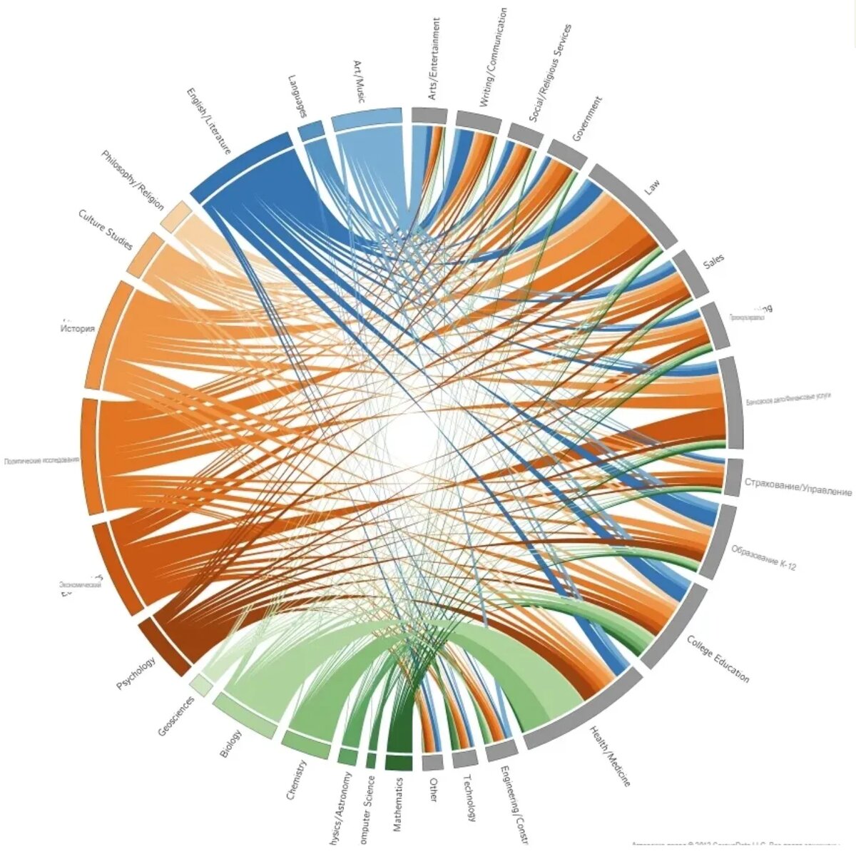 Например, математик Сатьян Девадосс составил карту карьерных исходов выпускников колледжа в зависимости от их основной специальности.