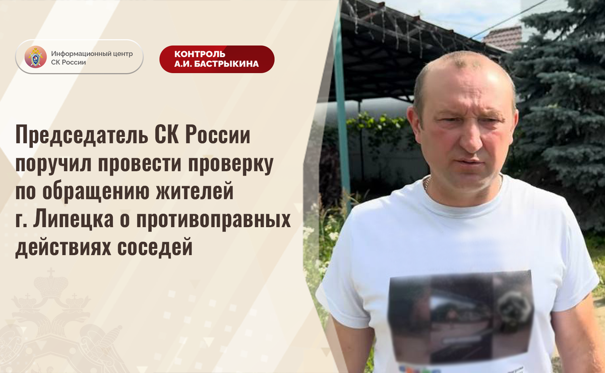 Председатель СК России поручил провести проверку по обращению жителей г. Липецка о противоправных действиях соседей В сети Интернет размещено видеообращение к Председателю СК России А.И. Бастрыкину семьи из города Липецка о совершении соседями в отношении них противоправных действий. С 2019 года семья подвергается нападениям и угрозам со стороны нарушителей, также они повреждают имущество пострадавших. Кроме того, озвучивается критика в адрес правоохранительных и судебных органов, поскольку многочисленные заявления результатов не принесли, никто к ответственности фактически не привлечен. Председатель Следственного комитета Российской Федерации Александр Иванович Бастрыкин поручил руководителю СУ СК России по Липецкой области Евгению Владимировичу Шаповалову провести процессуальную проверку и доложить о ее предварительных и окончательных результатах с учетом озвученных в публичном пространстве доводов. Исполнение поручения поставлено на контроль в центральном аппарате ведомства. #Следст