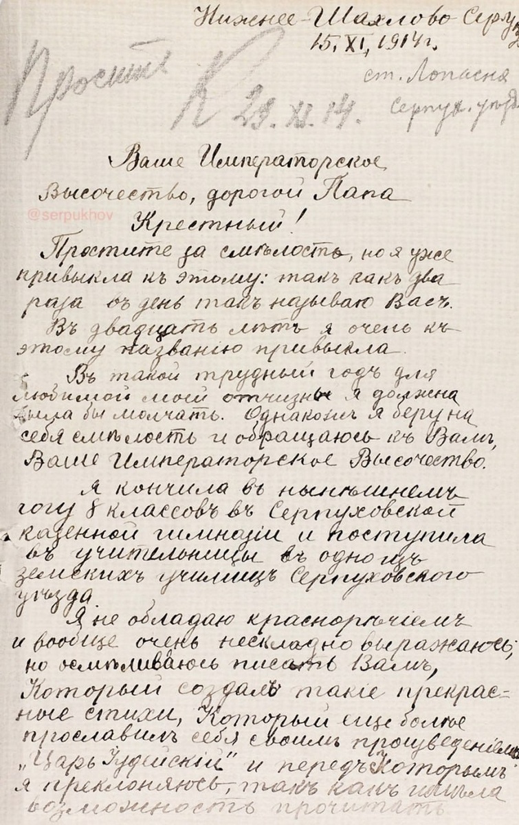 «Ваше Императорское Высочество, дорогой Папа Крестный…» Письмо из Серпухова, которое спустя 110 лет всё ещё трогает до мурашек. 🖋 В 1914 году, в разгар Первой мировой, 20-летняя учительница из деревни Нижнее Шахлово — Ираида Свечаревская — написала письмо своему крёстному. Не абы кому, а великому князю Константину Константиновичу, поэту, композитору и одному из самых уважаемых членов царской семьи. Она не просила за себя. Она писала ради братьев: «Вывести в люди своих братьев — моя заветная цель, поэтому я и не ухожу из семьи замуж». Ираида жалуется на условия деревенской школы — «сырой, холодный дом с гнилым полом, бывшая винная лавка» — и просит помочь ей перевестись в Серпухов, где она могла бы снимать жильё и готовить младших к поступлению в гимназию. 📷 К письму она приложила своё фото с надписью: «На память — любимому Отцу Крестному…» ✍️ Великий князь прочитал письмо. Через две недели на нём появилась его виза карандашом: «Просить. К. 29.XI.1914» — то есть содействовать.