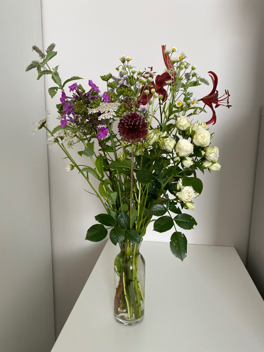 Что именно и как много нужно человеку для счастья? Вечный вопрос! То, что каждому свое и в определенный отрезок времени разное - это факт. У меня был долгий и тяжелый период в жизни, сейчас он, к счастью, заканчивается. Сначала меня ничего вообще не радовало, потом я нарочно пыталась отказаться от радостей и приятностей, вроде бы пыталась договориться со вселенной «мне ничего лишнего не надо, только пусть всё будет как раньше». Не сработало, конечно же) После этого самостоятельного отказа от излишков я привыкла к некоторому минимализму и даже стала получать от него удовольствие: переход из количества в качество состоялся! Ура Гегелю! На себе я ощутила в полной мере как малые изменения вызвали радикальные преобразования. И всё же о радостях! Прикрепила две картинки: букет 💐 из всего, на что упал глаз (роза-спрей, два вида флоксов, ромашки (лечебная и поповник), немного мяты и тысячелистник с диким луком) и «пирожное» 🍰 (бездрожжевой хлеб со сливочным маслом и ложкой вишневого