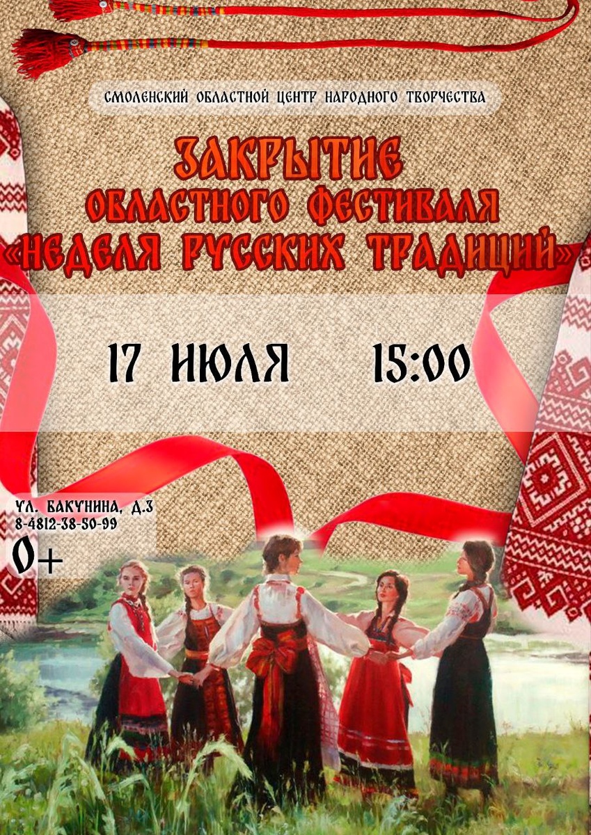 😍Праздник русской души: отмечаем День фольклора! 17 июля в 15:00 приглашаем на закрытие фестиваля «Неделя русских традиций». 🎵Вас ждет яркая концертная программа, на которой вы сможете насладиться народными песнями и музыкой в исполнении фольклорного ансамбля солистов «Таусень» Смоленской филармонии. Вход свободный 📍Адрес: ул. Бакунина, д. 3 ☎Телефон: 38-50-99 #СмоленскийЦентрНародногоТворчества