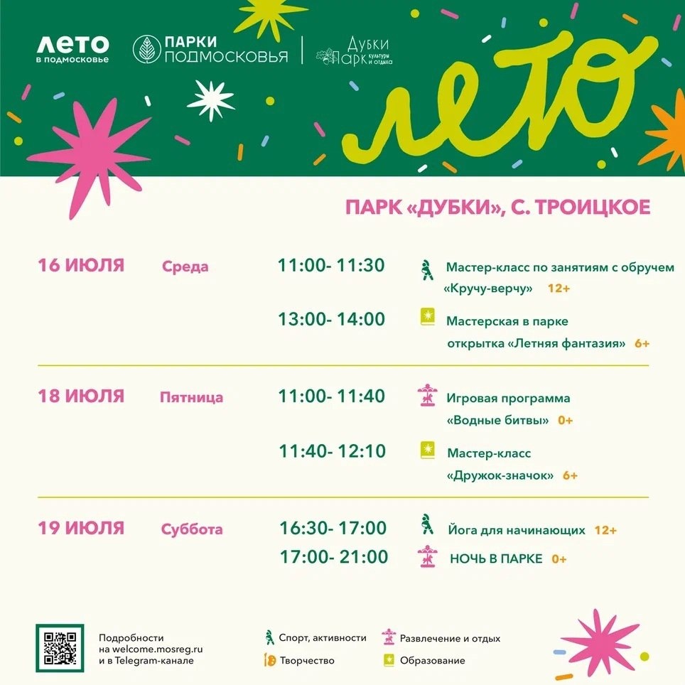 ✨ Афиша мероприятий в парке Дубки на этой неделе Приглашаем в Парк на мастер-классы, йогу, мастерскую А в СУББОТУ, 19 июля с 17:00 до 21:00 на фестиваль НОЧЬ В ПАРКЕ 🎴 🚫 Возраст: 0+ 🏢 Парк культуры и отдыха «Дубки» 📍 г.о.Чехов, с.Троицкое, парк "Дубки" 🪙 Вход свободный❗️ ⭐Разместить публикацию ⭐Поддержать канал голосом #webЧехов ✅ Мероприятия Чехов https://dzen.ru/id/66cc4b48e9ef144699238a51 http://vk.com/chekhov_events http://dzen.ru/chekhov_events