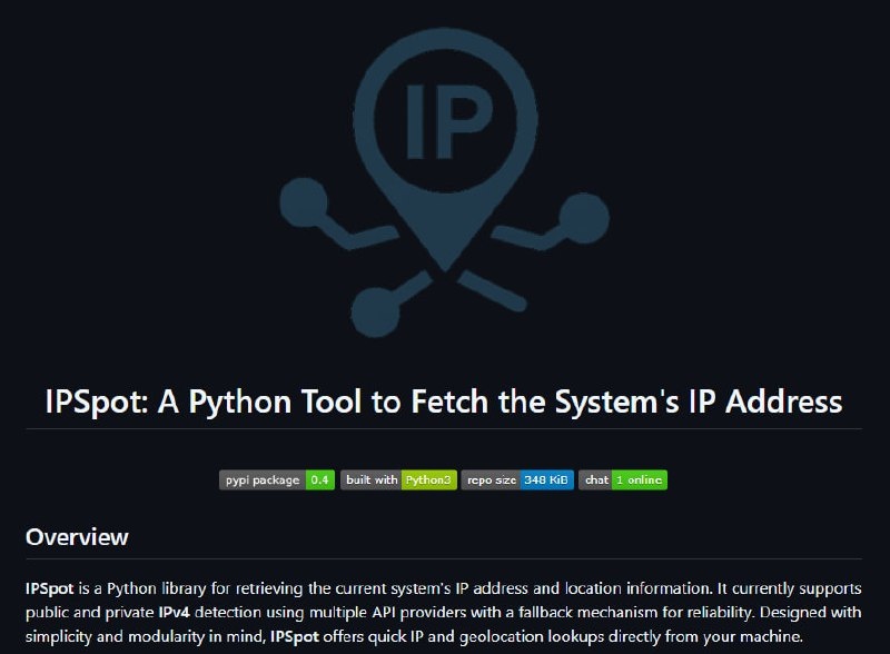 📍IPSpot — это лёгкая и удобная Python-библиотека и CLI‑утилита для получения как публичного, так и приватного IPv4-адреса вашей системы, а также дополнительных геолокационных данных.