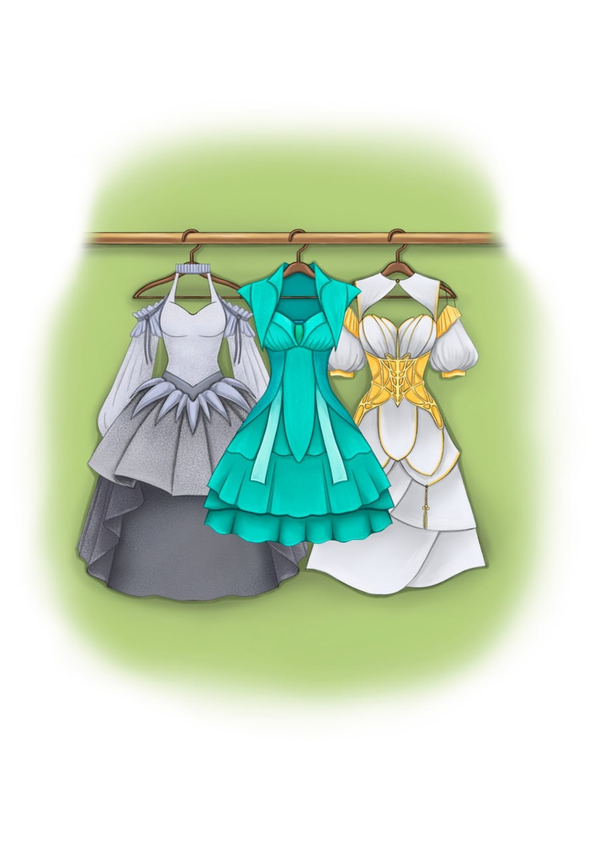 Кивком головы она указала на вешалку, на которой висело три наряда: бирюзовый, белый с золотом и серебристый.