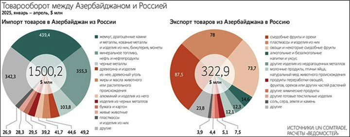 🇷🇺🇦🇿 "Ведомости" публикуют инфографику👆, показывающую степень экономической зависимости Азербайджана от России Как видим, южный сосед импортирует из РФ значительно больше, чем экспортирует в нее. В последние несколько лет поставки из России в Азербайджан традиционно превышали встречный поток в два-три❗️раза, а в начале 2025 года разница увеличилась сразу в пять‼️ раз. Мы им поставляем горючее, металл и удобрения (на Россию приходится порядка 17% всех закупок республики), а они нам – помидоры, заражённые плодожоркой. Доля Азербайджана в торговле России – менее 1%. Всего же внешнеторговый оборот солнечной республики в минувшем году находился на уровне 47,7 млрд долларов. То есть Россия обеспечила почти десятую часть от него. Добавим к этому наши инвестиции и совместную реализацию масштабных инфраструктурных проектов. Например, мы строим международный транспортный коридор "Север – Юг". Он проходит через территорию Азербайджана и соединяет Россию с Индией. В 2023-м вице-премьер М