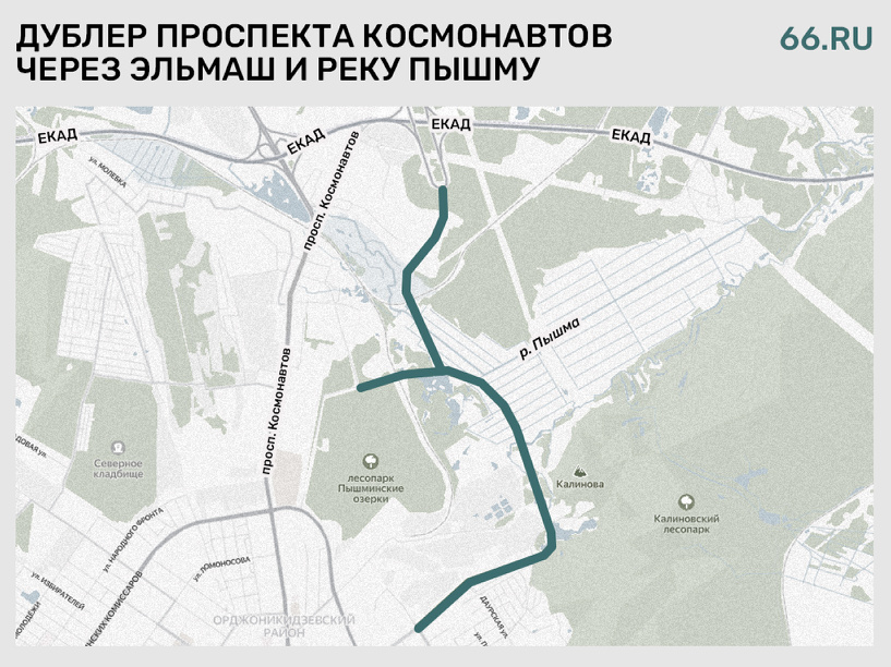 Свердловское управление государственной экспертизы с третьей попытки одобрило проект строительства дублера проспекта Космонавтов. Госэкспертиза отклоняла проект дважды: сначала — из-за того, что трассу проложили в подтопляемой зоне, затем — потому что компания-подрядчик («РосИнсталПроект») сорвала сроки сдачи проекта, не согласовав его с владельцами инженерных сетей, городскими службами и управлением автомобильных дорог. Русла рек Пышмы и Камышенки переустроят. По проекту на участке запланировали очистные сооружения, два пешеходных перехода, тротуар и велодорожку от Пышминских Озерков. На втором этапе работ построят многоуровневую развязку у ЖК «Изумрудный бор», сообщил близкий к мэрии телеграм-канал «Екатеринбург. Главное».