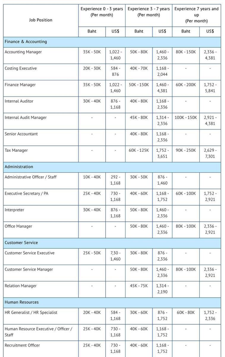Какую зарплату должны получать ваши тайские сотрудники? (2025) Минимальная зарплата (МРОТ) в Таиланде варьируется по провинциям и составляет от 337 до 400 бат в день. Основные регионы: ✅ Пхукет, Чонбури (включая Паттайю), Районг, Чаченгсао, Сурат Тхани (включая Ко Самуи и Пханган) — 400 бат/день (10,400 бат/месяц, ~306 USD) ✅ Бангкок — 372 бата/день (9,672 бат/месяц, ~284 USD)*** Планируется ввести 400 бат/день ✅ Краби — 352 бата/день (9,152 бат/месяц, ~269 USD) ✅ Чиангмай — 380 бат/день (9,880 бат/месяц, ~291 USD) ⚡️⚡️⚡️⚡️Мы рекомендуем предлагать щедрые зарплаты, превышающие МРОТ, чтобы поддерживать местное население, повышать их уровень жизни и мотивировать сотрудников Ниже приведена рекомендуемая оплата труда для тайских работников в зависимости от опыта (в батах за месяц) ⤵️ Туристический сектор Официанты 🟠0–3 года: 10,400–15,000 бат + чаевые 🟠3–7 лет: 15,000–20,000 бат 🟠7+ лет: до 25,000 бат Менеджеры отелей ⚫️0–3 года: 20,000–35,000 бат ⚫️3–7 лет: 35,000–60,000 бат ⚫️