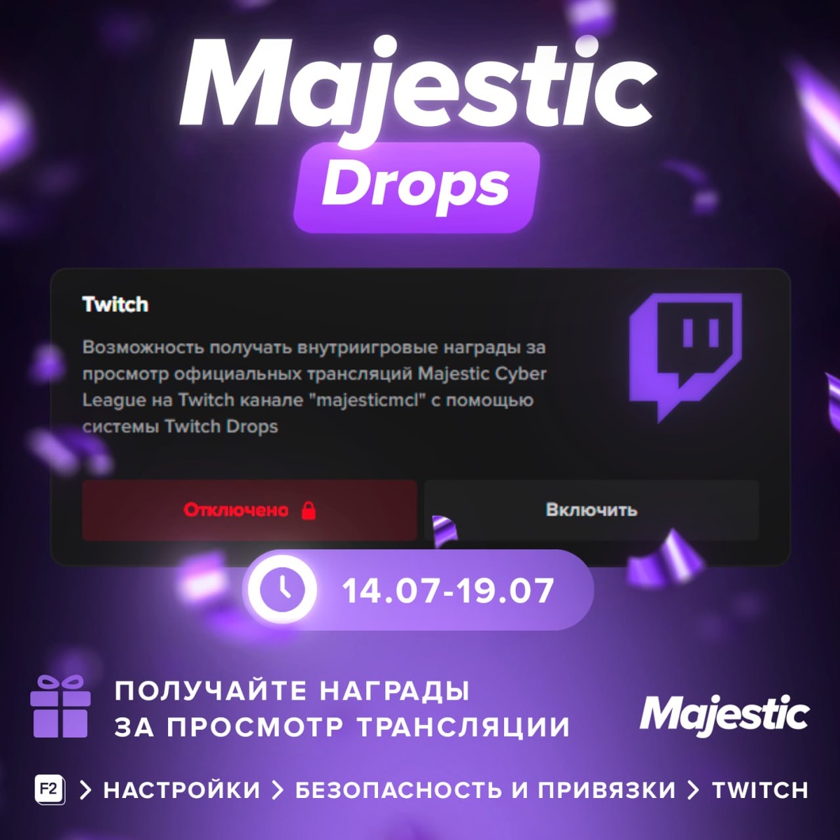 😏 Majestic Drops — получайте награды за просмотр турнира Gunzone VIII С 14.07 до 19.07 зрители могут забрать бонусы за просмотр прямой трансляции. Что нужно сделать? — Привяжите аккаунт Twitch в меню «F2 - Настройки - Безопасность» — Следите за трансляциями турнира на Twitch-канале Majestic MCL — Получайте награды в донат-инвентарь Рекомендуем привязать аккаунт на одном сервере — если он привязан к нескольким, награда упадет на случайный. ❤️ Majestic Role Play