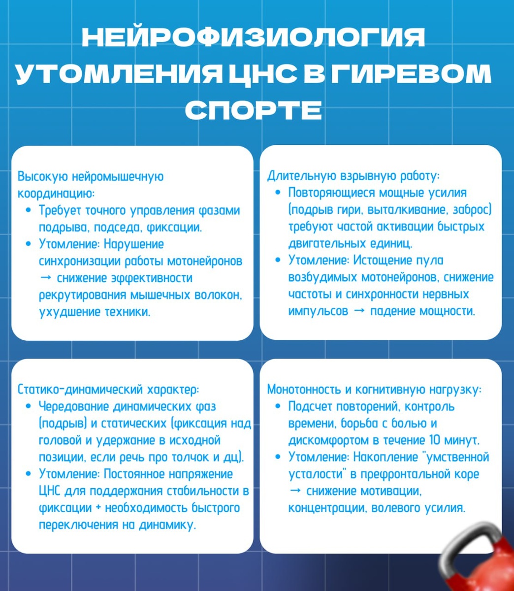 Нейрофизиология утомления ЦНС в гиревом спорте🙇♂️ Гиревой спорт особенен тем, что мы находимся под напряжением почти всегда. Даже фазы отдыха сопровождаются давлением гирь, поэтому перегрузка на ЦНС огромная! Нейрофизиология утомления ЦНС в гиревом спорте — это один из ключевых аспектов, определяющий как спортивные результаты, так и риск перетренированности. Гиревой спорт создает уникальную нагрузку на ЦНС, сочетая факторы, которые указаны на картинке! Далее немного с научными терминами, но постараемся довести до просто объяснения процессов. Разберём основные нейрофизиологические механизмы утомления ЦНС в гиревом спорте: 📝Нарушение кортико-спинальной возбудимости: ♻️Суть: Снижение способности моторной коры генерировать мощные и эффективные сигналы к спинному мозгу. 🔒Причина: Накопление ингибирующих нейромедиаторов (особенно ГАМК - гамма-аминомасляная кислота), защитный механизм ЦНС от перевозбуждения. ⚡️Проявление: Субъективное ощущение "тяжести" гири, невозможно