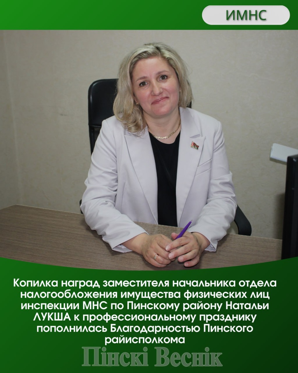 ✅Копилка наград заместителя начальника отдела налогообложения имущества физических лиц инспекции МНС по Пинскому району Натальи ЛУКША к профессиональному празднику пополнилась Благодарностью Пинского райисполкома. Работа напряженная, ведь вместе с сотрудниками отдела ей приходится заниматься исчислением, ведением лицевых счетов и учетом подлежащих уплате налогов - подоходного с физических лиц в фиксированной сумме; на недвижимость; земельного; транспортного; единого с индивидуальных предпринимателей и иных физических лиц; на профессиональный доход, а также арендной платы за землю; сбора за осуществление ремесленной деятельности плюс контролировать своевременность и полноту их уплаты в бюджет. И это в отношении физических лиц, зарегистрированных на территории Березовичского, Валищенского, Поречского, Оснежицкого, Парохонского, Лопатинского сельских советов, 27 садовых товариществ, трех гаражных кооперативов. @Пинский Вестник ЮТУБ | САЙТ| ИНСТ | ВК | ОК | ФЕ | Прислать новость