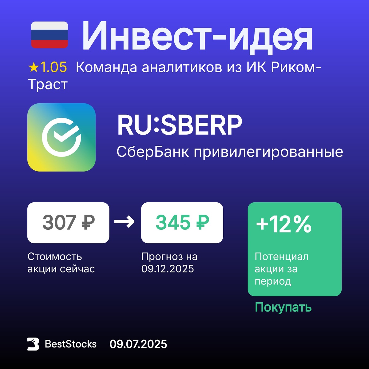 🇷🇺 Инвест-идеи по русским акциям Прогноз по акции СберБанк привилегированные Прогнозная цена: 345 ₽ (+12%) Рекомендация: Покупать Дата прогноза: 09.07.2025 Прогноз до: 09.12.2025 Инвест-компания: ИК Риком-Траст Автор прогноза: Команда аналитиков Ещё рекомендации на сегодня → ••••• 🆕 Новая фича на сайте — Тепловая карта рынка. Вы можете оценить динамику рынка в моменте: какие акции больше всего растут или падают, какие торгуются больше других. Всё это бесплатно и доступно без регистрации. Пользуйтесь!