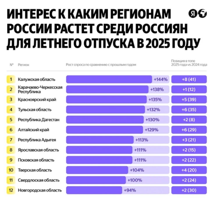 ⛺️Калужская область — лидер по росту спроса на отдых По данным популярного сервиса путешествий в этом году самыми востребованными направлениями оказались Краснодарский край, Санкт-Петербург и Ленинградская область, а также Крым. По количеству бронирований на лето лидирует Краснодарский край, но спрос на него упал по сравнению с прошлым сезоном на 45%. А Калужская область стала лидером по росту спроса на отдых. По сравнению с прошлым годом: +144%. В прошлом году регион посетили почти 4 млн туристов Похоже, ждем в этом году новые рекорды. «Инвесторы с помощью мер господдержки создают новые места в гостиницах и кемпингах. Создаем условия для подготовки и повышения квалификации кадров в индустрии гостеприимства. Одно из приоритетных направлений – создание туристических троп» — Владислав Шапша. 🤖 Прислать новость 📺 Заказать рекламу