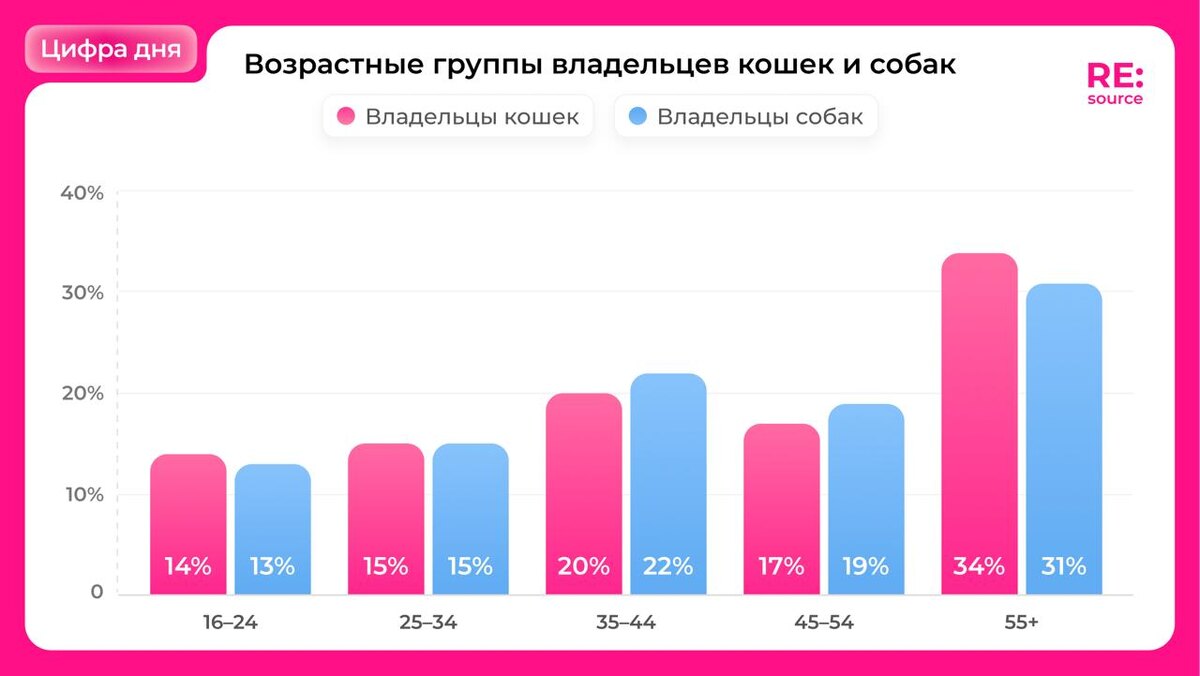 🔹🔹🔹 56% домохозяйств в России имеют кошку и/или собаку А самая крупная возрастная группа среди владельцев домашних животных — 55+. Животные все больше становятся частью социальной жизни владельцев, развивается индустрия услуг, украшений, мероприятий и даже люксовой одежды и аксессуаров. Например, «Много лосося», запускает меню для питомцев, Crocs — обувь для собак, а Zarina — раздел «Товары для животных» на сайте. Источник: NielsenIQ (рус) #цифрадня Подписаться на RE:source