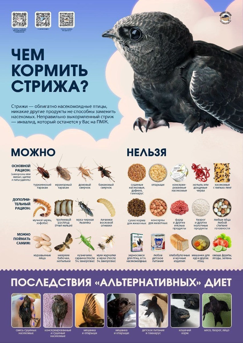 1. Стрижи питаются только насекомыми, кормить каждого из них необходимо вручную, а любое повреждение пера приводит к катастрофическим последствиям. Стрижа нельзя кинуть в вольер со словами "выпустим, когда перелиняет". Стрижу нельзя сделать мешанку из яйца и творога, потому что "поставка насекомых только завтра".