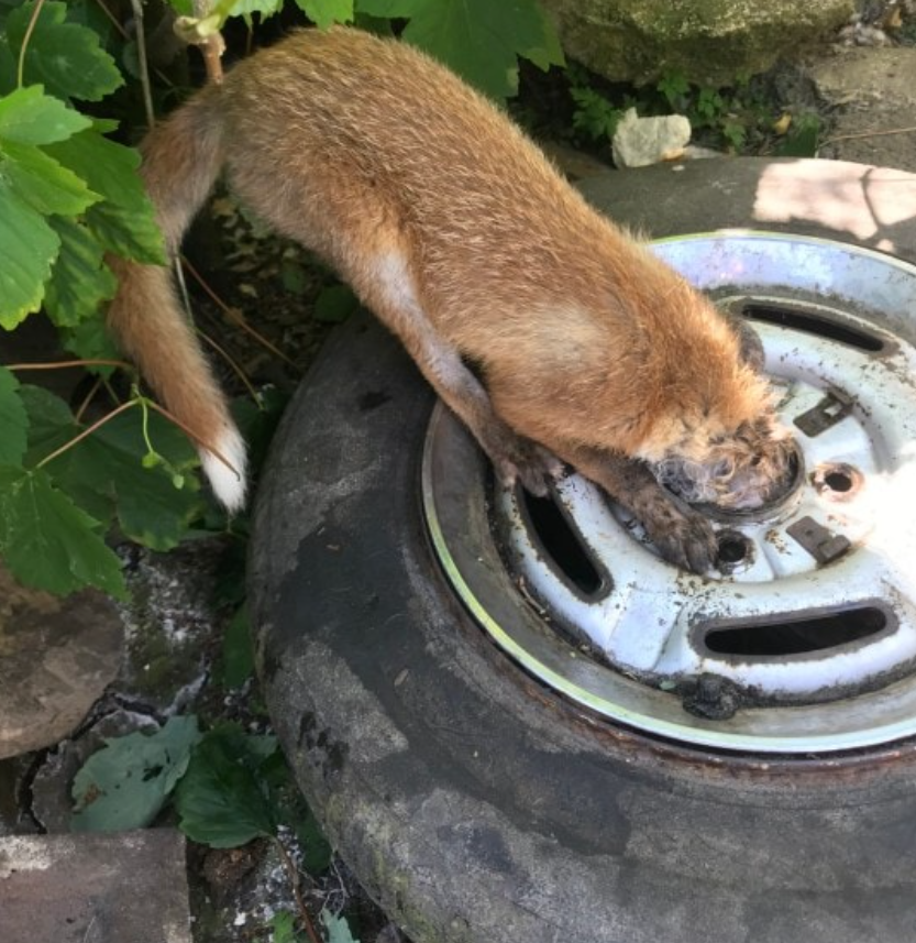 Молодой лис каким-то образом засунул голову внутрь и теперь не мог выбраться.