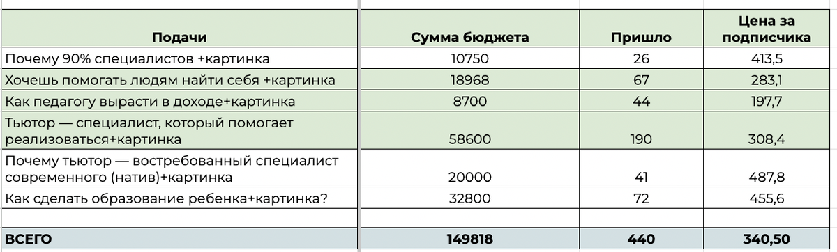 В среднем важно протестировать каждую подачу минимум в 3-4 каналов разных тематик, чтобы понять, какая их связок приносит целевые регистрации за меньшую стоимость. Обычно на тестирование уходит 15 000-20 000₽ (подбирается для каждого клиента индивидуально от бюджета!).