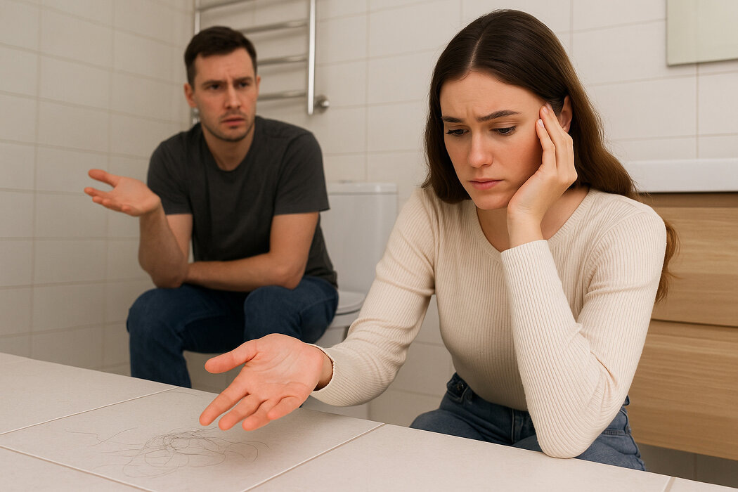 Белая плитка, светлый пол — красиво, но видно всё. Особенно волосы. И если в доме живёт женщина с длинными волосами, их невозможно полностью контролировать: они выпадают каждый день, остаются на полу, цепляются за одежду и заметны в каждом углу. Но когда на это начинает постоянно указывать партнёр, и особенно если это сопровождается раздражением, колкостями или молчаливым напряжением, бытовой вопрос превращается в личный. Для многих женщин такие комментарии становятся источником вины. Это мои волосы — значит, это моя ответственность. Муж раздражается — значит, я не справляюсь. Возникает желание постоянно пылесосить, подбирать, прятать, делать вид, что ничего не было. Но вместе с этим растёт усталость. Потому что женщина начинает воспринимать собственное тело как источник раздражения. Не просто волосы — а «мои» волосы мешают, раздражают, злят. Значит, я как будто неуместна. А дальше — внутренний конфликт. С одной стороны, действительно хочется уюта и чистоты. С другой — непонятно, где з
