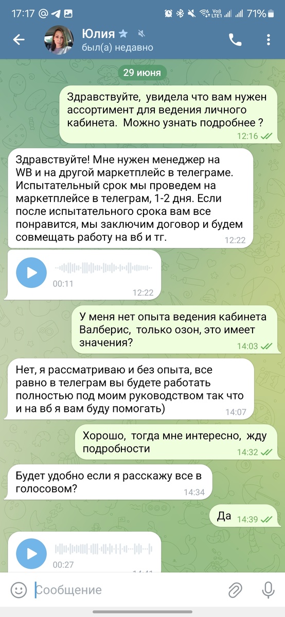 Привет дорогие читатели 🖐 Искала я себе подработку, и нарвалась на мошенников. Я сразу почувствовала неладное, но решила пойти и попробовать. Думаю, пока мне это ни чего не стоит, а как попросят денег, сразу сольюсь)) Вы знаете, что я занимаюсь продажами на озон, и у меня свое ИП. Поэтому у меня в телеграм есть много полезных чатов, в которые я иногда заглядываю или подписана на случай "а вдруг потребуется ". Есть у меня чат с сертификацией, там я заказывала сертификат на свои товары, которым пользуюсь по сей день. И вдруг в этом чате, среди заявкок на сертификат, я вижу сообщение -"ищу помощника менеджера по маркетплейсам, пишите в личку". Ну я и написала, дальше предоставляю скриншоты всей переписки. И после обьясню если вам вдруг будет не понятно, что за схема)) Вот и вся любовь! Вобщем, ты уже потратил 30-60 минут своей жизни и тебе говорят, вот твоя доля 13670р, ни чего себе! За час то работы, шикарно конечно 😁💪 Но чтоб получить деньги, нужно перевести деньги, вот это уж