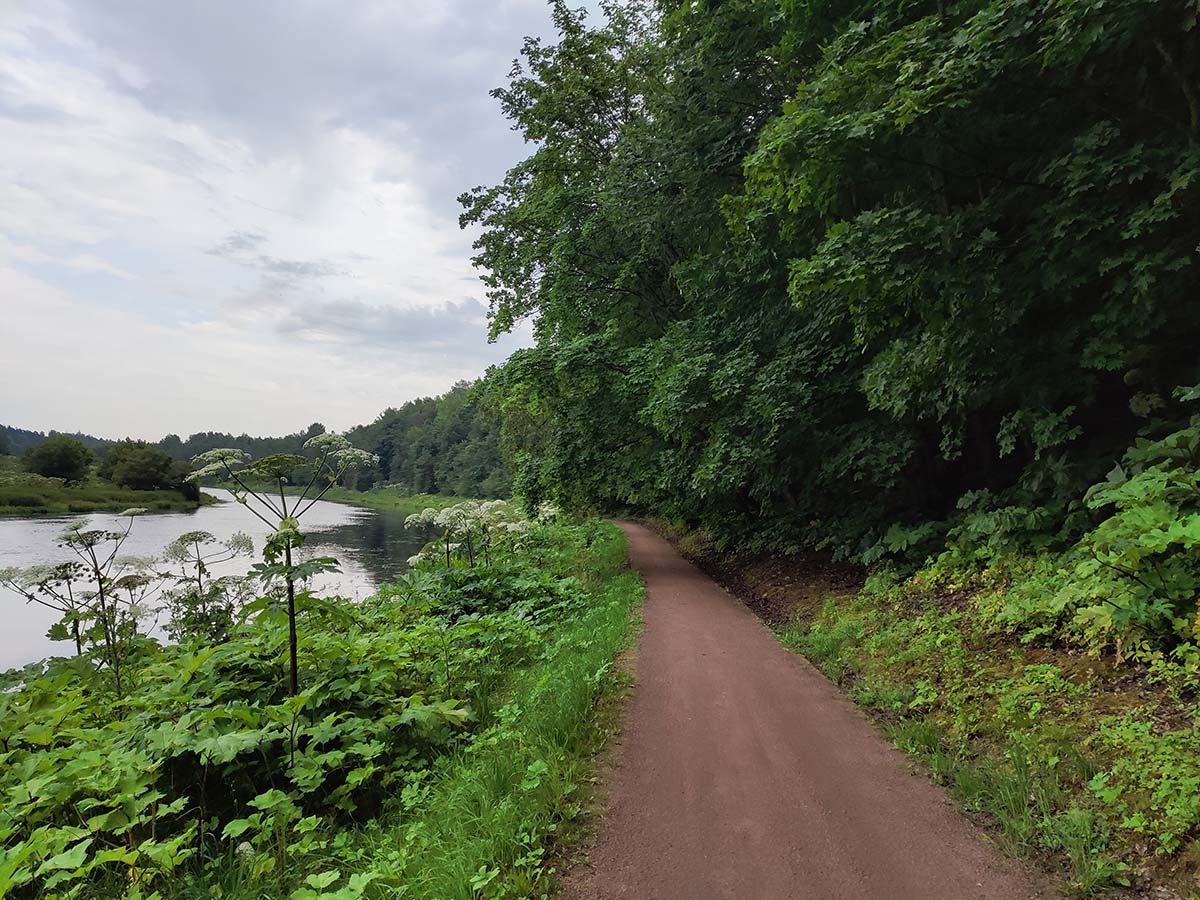 Река чистая, купаться приятно, подъездов к реке не так много - значит шашлычников особо не будет, леса достаточно - так что тень обеспечена. Никак не могли найти, что это за тропа, пока случайно не наткнулись на сайт велосипедистов, и вот радость – Вело2. Но информации по ней ничтожно мало.