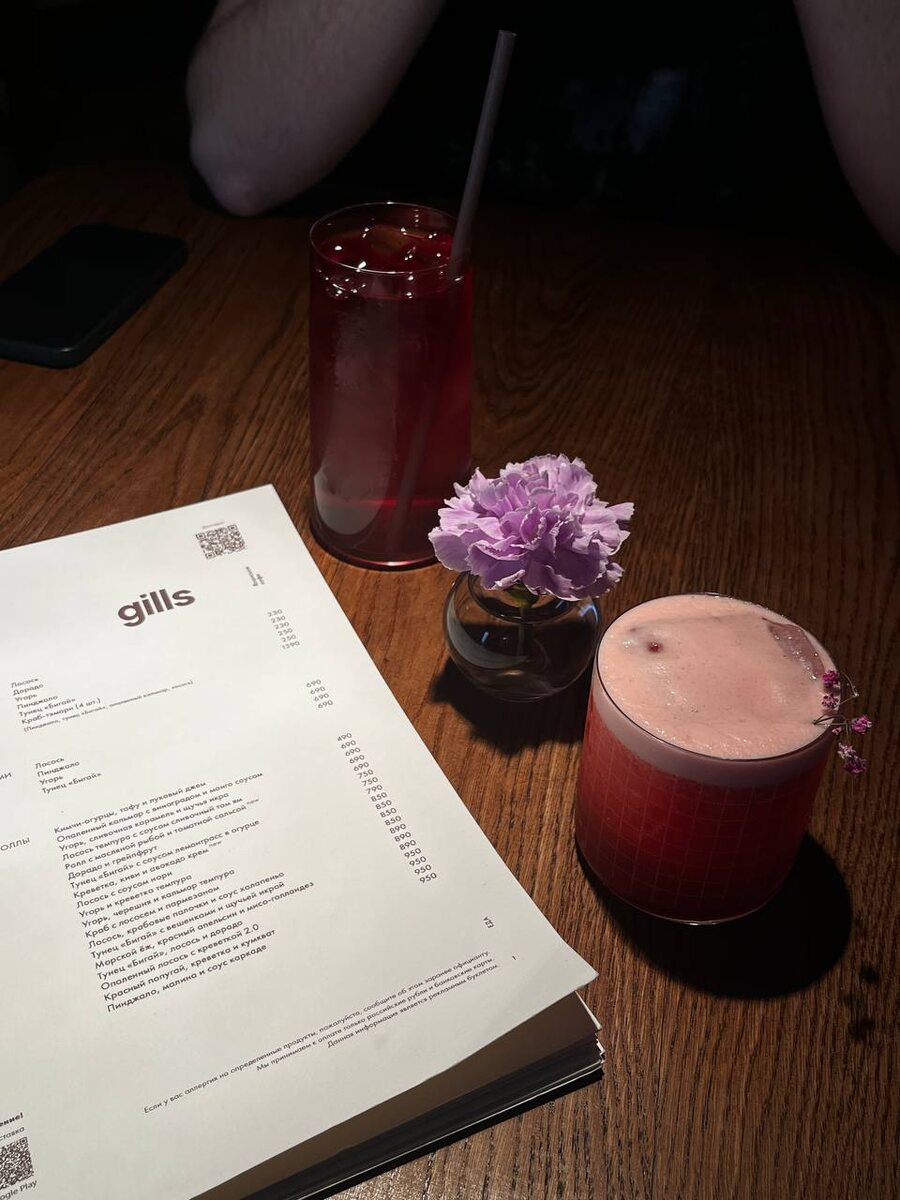 ул. Казанская 8-10 #метроНевский #метроАдмиралтейская Gills - известное место, куда нужно идти пробовать необычные роллы и суши. Мы очень давно собирались сходить туда и наконец-то дошли. Вечером в будний день столики были все заняты, нам повезло, что удалось сесть, так что лучше бронировать. Интерьер лаконичный, без излишеств, но и ни за что особо глаз не цепляется, хороший свет над столиками, чтобы освещать еду. Вот сами блюда выглядят действительно красиво, подача на высоте, все отлично смотрится. Также обслуживание очень хорошее, официанты легко сориентируют вас по меню, расскажут про блюда. Интересная коктейльная карта в заведении, хотелось бы попробовать больше напитков из нее. Роллы с креветкой, авокадо и киви были неплохими, но ни авокадо, ни киви не чувствовался, поэтому не могу назвать эти роллы сильно привлекательными. 7/10 Роллы с пинджало, малиной и соусом каркаде поразили, но, к сожалению, со знаком минус. Роллы с белой рыбой - это в целом странный выбор, но тут ее еще б