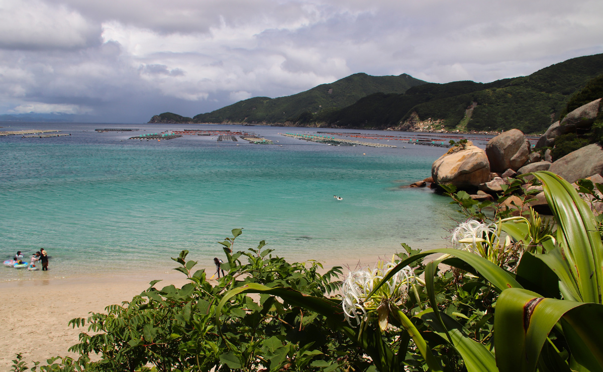 Думали: "Вот ведь, не повезло!" Но, ближе к обеду погода разгулялась, и мы более 5 часов проплавали с масками вот на таком многолюдном, по мнению японцев, пляже. Считается, что на местных пляжах летом всегда много народу. Ведь Kashiwajima привлекают туристов удивительным цветом и прозрачностью моря. Пляжи острова впечатляют сверкающей бирюзовой водой! Мягким светлым, чуть розоватым, песком. И скалами необычной формы. Пейзажи здесь такие к
