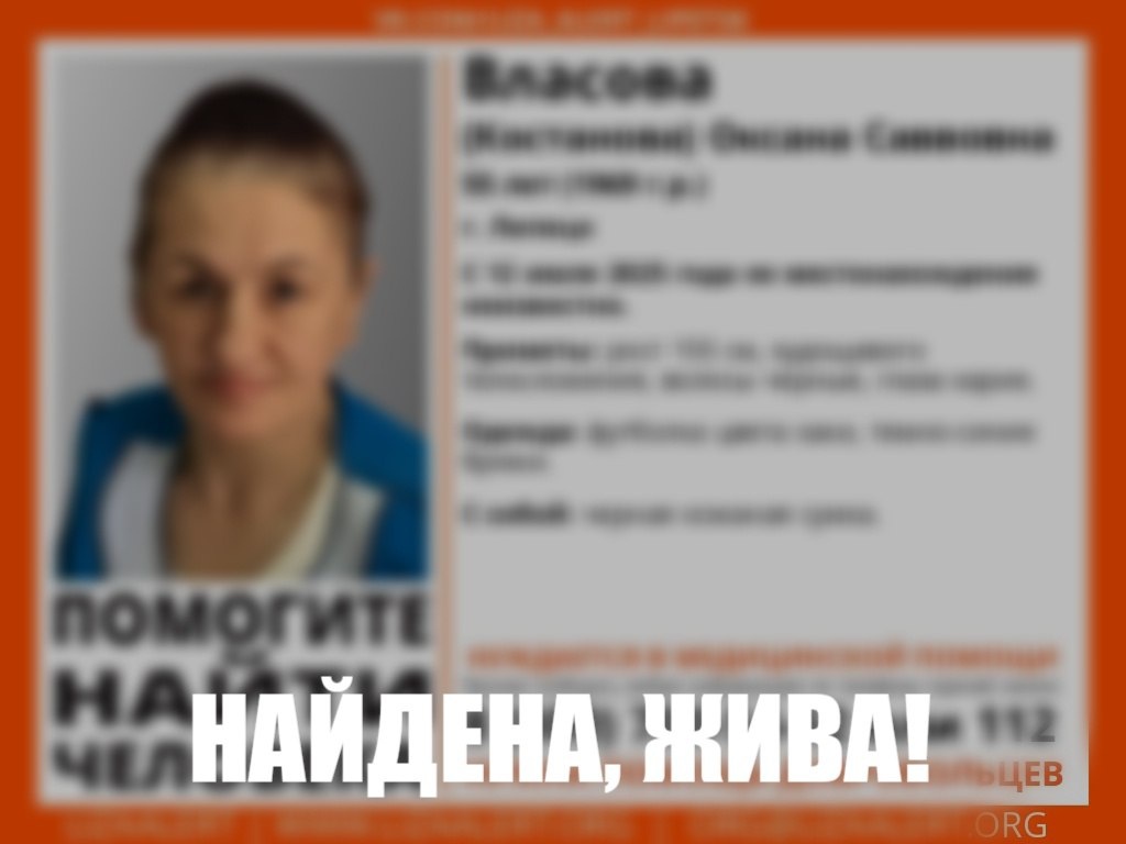 В Липецкой области завершились поиски 55-летней Оксаны Саввовны Власовой (Костановой). Напомним, в минувшую субботу, 12 июля, женщина ушла и не вернулась. С тех пор липчанка не выходила на связь. Осложнялись поиски тем, что Оксана Власова нуждалась в медицинской помощи. К счастью, все завершилось успешно. Волонтеры поисково-спасательного отряда «Лиза Алерт» по Липецкой области сообщили, что женщину нашли живой.