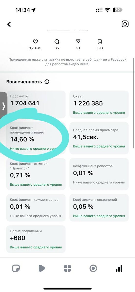 Формула миллионника-рилса, который залетит в Инсте Именно в цифрах Смотрите в статистике в приложении Edits: 🟠<25% кэф пропущенных видео (сколько людей пролистали дальше) 🟠>50% удержания до конца (сколько чел досмотрело) Вот когда такие цифры, ролик набирает сотни тысяч и с высокой вероятностью уйдет в >1 млн просмотров Проверьте свою статистику. Очень показательно получается.