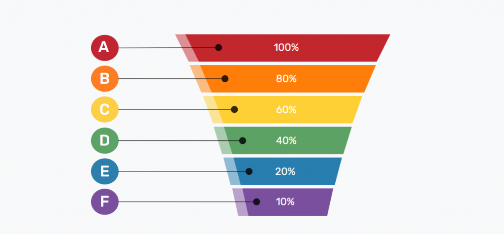 - Визуализация пути клиента. Воронка продаж демонстрирует путь, который проходит потенциальный клиент — от первого контакта с вашим брендом до покупки. Она помогает понять, на каких этапах снижается конверсия и где нужно оптимизировать маркетинговую стратегию.