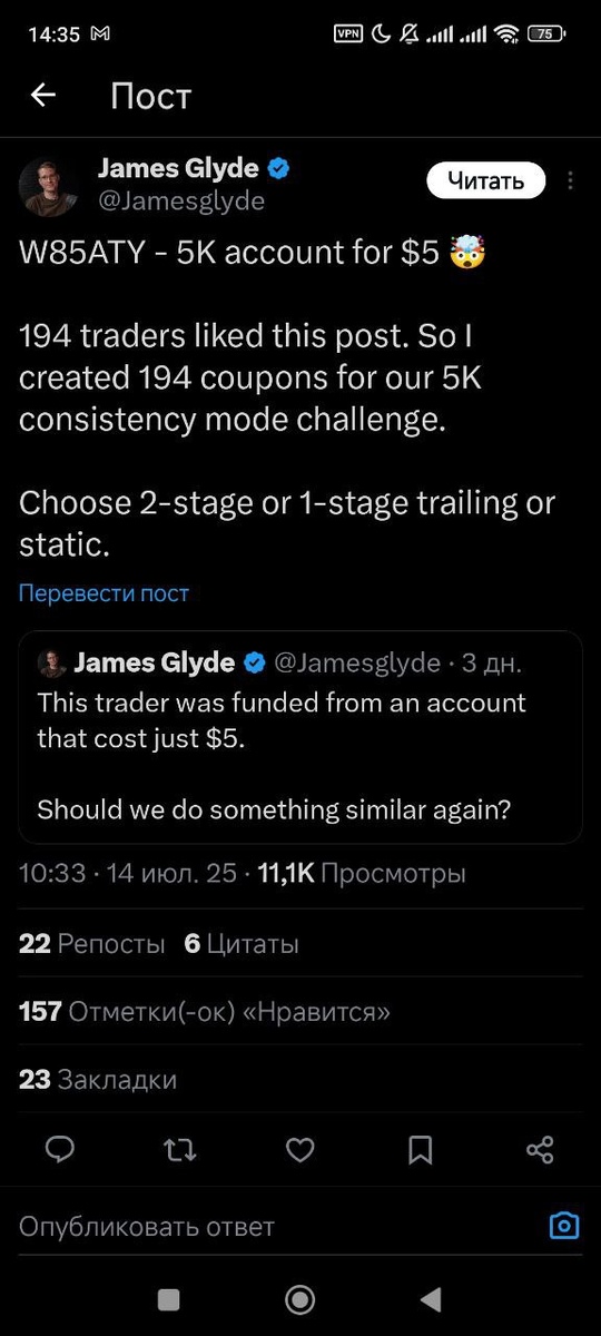 ‼️Внимание ‼️ кто самый шустрый может купить за пять долларов счет на 5К от PipFarm, СЕО сейчас раздает по промокоду в твиттере , счет надо выбрать консистанси 1 или 2 фазный, я успел взять, не знаю что это такое но за пять баксов пойдет