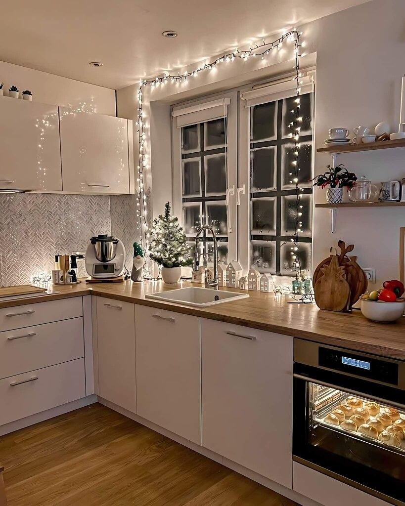 Секрет профессионала: Важно выбирать гирлянды, которые сочетаются с общей цветовой палитрой кухни, чтобы не перегрузить пространство. И желтая (золотая) гирлянда почти всегда лучше белой.