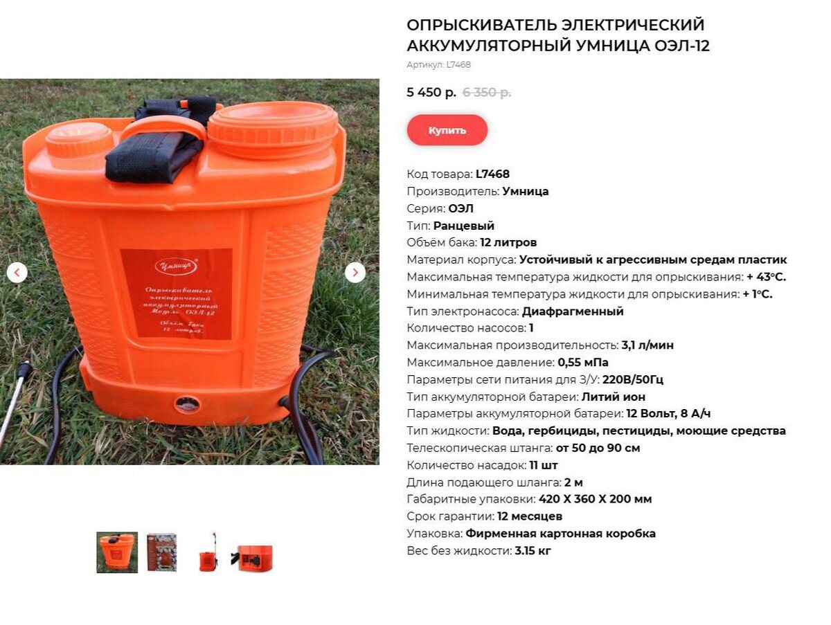 Друзья, всем добрый день 🌸 Заинтересовались распылителем/разбрызгивателем для обработки садового участка. Из опыта… Было много разных, в этом году приобрела Умницу (разбрызгиватель + воздуходувка). Не скажу, что прям ВАУ… приловчившись можно работать …через воздуходувку площадь обработки увеличивается + сокращается время на обработку, что немаловажно …ну и соответственно воздействие химии на организм. Купила 12 литровый аккумуляторный, приловчилась …. тяжеловато, но я справляюсь без помощи, приблуду на плечи и вперед. Ставлю стул на него разбрызгиватель, и маленький стульчик …. На маленький стульчик присела и разбрызгиватель на плечи (главное назад не завалиться когда встаешь) как то так. Почему не ВАУ…, потому что все «хилое», штампованное, пластмассовое …. посмотрим сколько выдержит. Цена бюджетная. Заказывала напрямую на сайте, сейчас скидки есть. НЕ РЕКЛАМА, просто свой опыт.