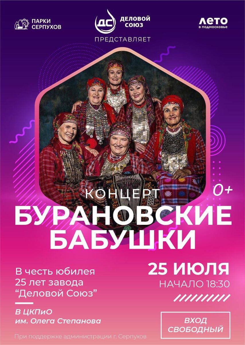 «Бурановские бабушки» выступят в Серпухове в честь юбилея завода «Деловой Союз» Бесплатный концерт финалисток «Евровидения-2012» состоится уже 25 июля. Мероприятие организовано заводом «Деловой Союз» в честь своего 25-летия при поддержке администрации округа. В программе организаторы пообещали, что легендарный коллектив из Удмуртии исполнит любимые хиты. Начало программы в 18.30. Вход свободный