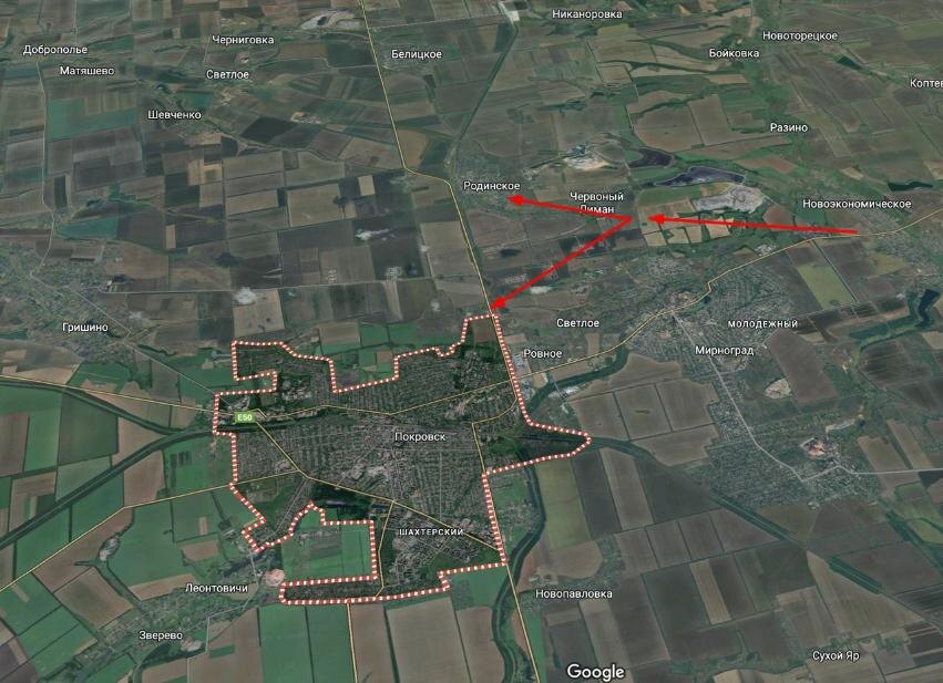 Как сообщают украинские каналы, российские войска резко рванули вперед к северу от Красноармейска (бандеровцы называют его Покровском) и зашли в Родинское, которое всего в четырех километрах от города. Занятие этого населенного пункта «накроет крышкой гроба» Красноармейско-Димитровскую (Покровско-Мирнонградскую) агломерацию.