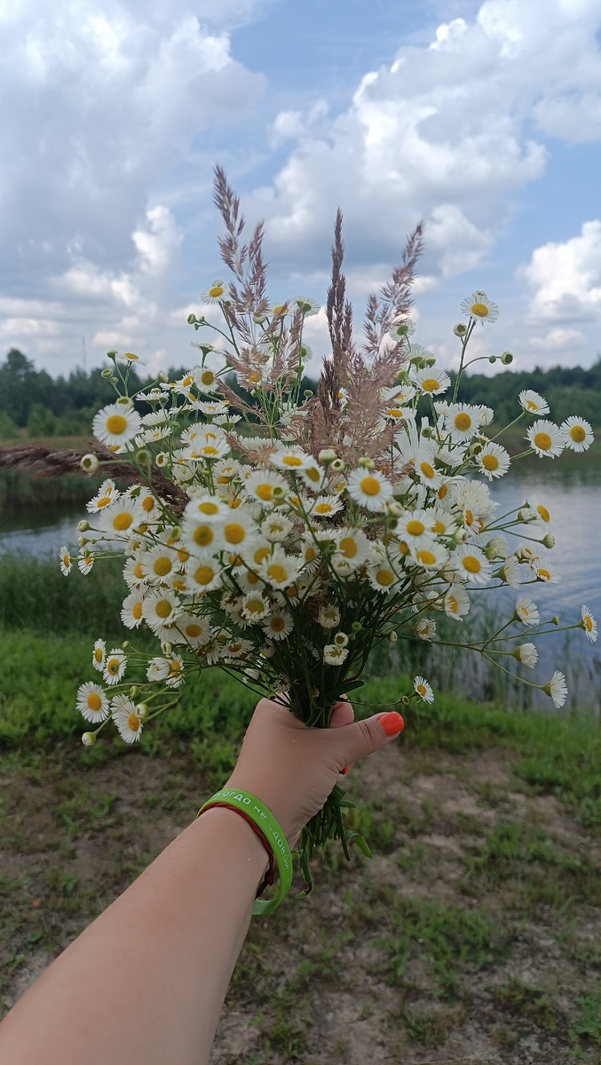 Букет полевых ромашек. По традиции за лето, хотя бы один раз мне надо собрать букетик полевых цветов. Обычно я собираю цветы на даче, а тут в городе нашла у водоёма.