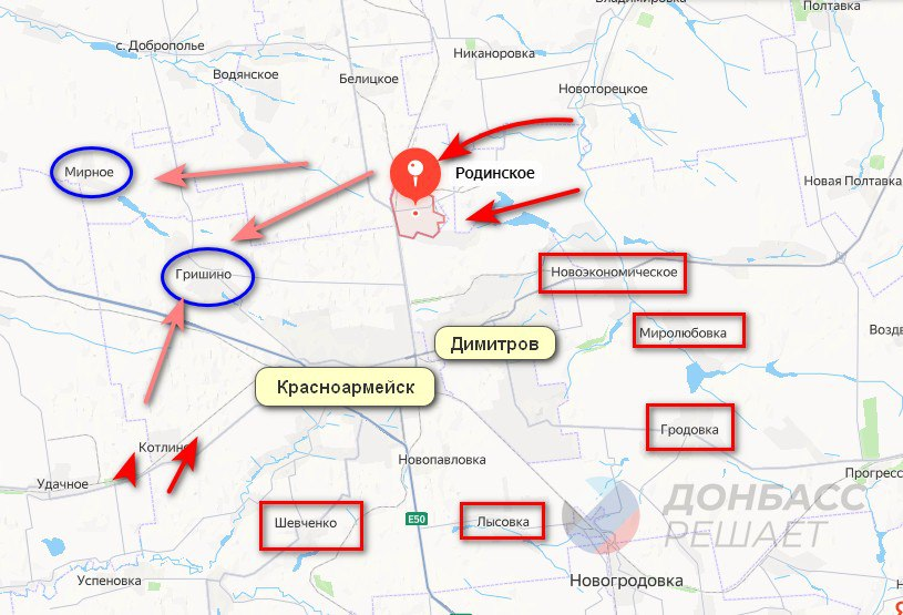 Российская армия активно продвигается к городу севернее агломерации Красноармейск – Димитров. Освобождение Разино позволило нашим войскам обеспечить переправу через реку Казенный Торец, открыв прямой путь на Родинское. ▪️ ВСУ, несомненно, будут стараться удержать этот некогда славный шахтерский город, так как в случае освобождения его российской армией Красноармейск и соседний Димитров фактически окажутся в полуокружении. ▪️ Для снабжения группировки в агломерации у противника останется последняя дорога – от Доброполья через Гришино, которая окажется под прямым огневым воздействием ВС РФ (трасса на Павлоград давно под неусыпным контролем наших дроноводов). ▪️ После Родинского целью российских штурмовых подразделений наверняка станет уже упомянутое Гришино и соседнее Мирное, а с юга – Сергеевка. В дальнейшем крышка на красноармейско-димитровском котле захлопнется. ▪️ По опыту предыдущих компаний ВСУ по удерживанию «крепостей» в Донбассе, киевское командование отдаст приказ на отход гар
