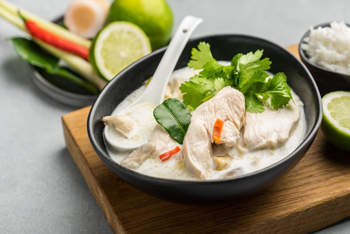 Суп том-кха-кай. Суп Том кха - блюдо тайской кухни: острый куриный суп с кокосовым молоком. Впервые рецепт супа том кха был включён в состав кулинарной книги в 1890 году, однако сам суп, вероятно, гораздо старше. Согласно этому рецепту суп, готовился из утки, которая позже была заменена на менее жирную и более доступную курицу. На сегодняшний день суп том кха подаётся во многих тайских и паназиатских ресторанах по всему миру, наряду с супом том ям, от которого он отличается, в первую очередь, добавлением кокосового молока, которое придает ему более мягкий вкус и кремовую текстуру.