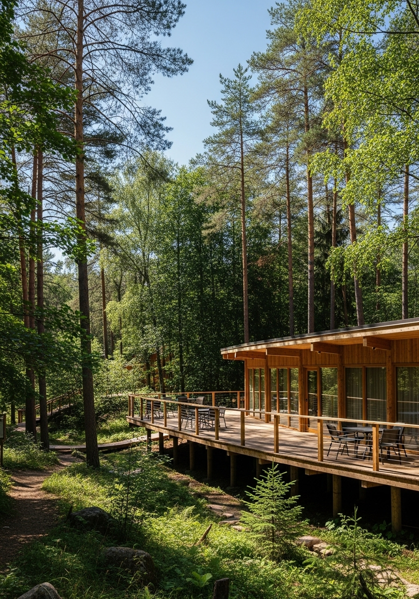 Семейный глэмпинг расположен в густом хвойном лесу Ленинградской области, предлагая гостям полное погружение в природную среду. Комплекс состоит из стильных геодезических куполов и деревянных домиков, органично вписанных в лесной ландшафт.