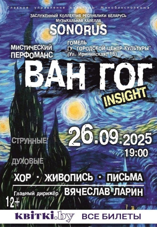 В Гомеле состоится мистический перформанс «Ван Гог. Insight» 26 сентября в ГЦК выступит заслуженный коллектив республики Беларусь Музыкальная капелла SONORUS из Минска.