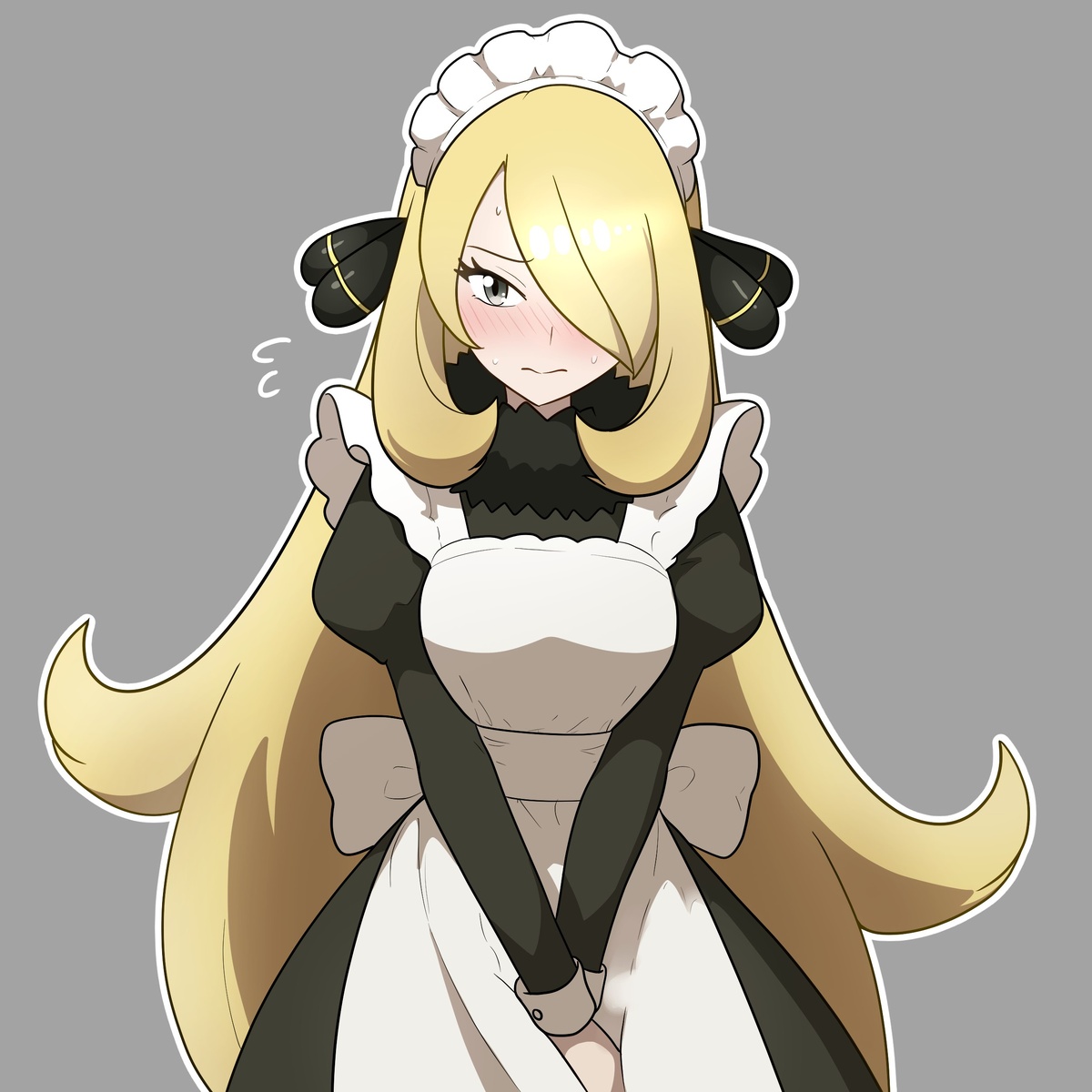 🎨 Художник: muis0802 @PokePikaProject ✏️ Теги: #1girl #absurdres #alternate_costume #apron #black_dress #black_eyes #blonde_hair #blush #breasts #closed_mouth #cynthia_(pokemon) #dress #enmaided #flying_sweatdrops #fur_collar #fur_trim #grey_background #hair_ornament #hair_over_one_eye #highres #juliet_sleeves #long_hair #long_sleeves #looking_at_viewer #maid #maid_headdress #medium_breasts #muis0802 #one_eye_covered #own_hands_together #pokemon #pokemon_dppt #puffy_sleeves #simple_background #solo #sweat #swept_bangs #very_long_hair #white_apron
