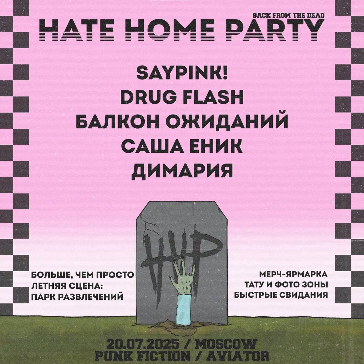 Возвращение 2007 на HATE HOME PARTY 🪩 Концертная DIY вечеринка по мотивам той самой эпохи объединит сотни ярких зрителей, известных гостей из музыкальной и других творческих сфер: фотография, мерч, видео, скейтбординг, тату, лейблы и менеджмент 🌟 На сцене: 🌟 saypink! 🌟 Drug Flash 🌟 балкон ожиданий 🌟 Саша Еник 🌟 ДИМАРИЯ Вас ждёт полный парк развлечений: мерч-ярмарка, тату и фото зоны, быстрые свидания и многое другое! 📎 20 июля, 20:00 🪩 Москва, Punk Fiction, арт-пространство «Авиавтор» Билеты / встреча